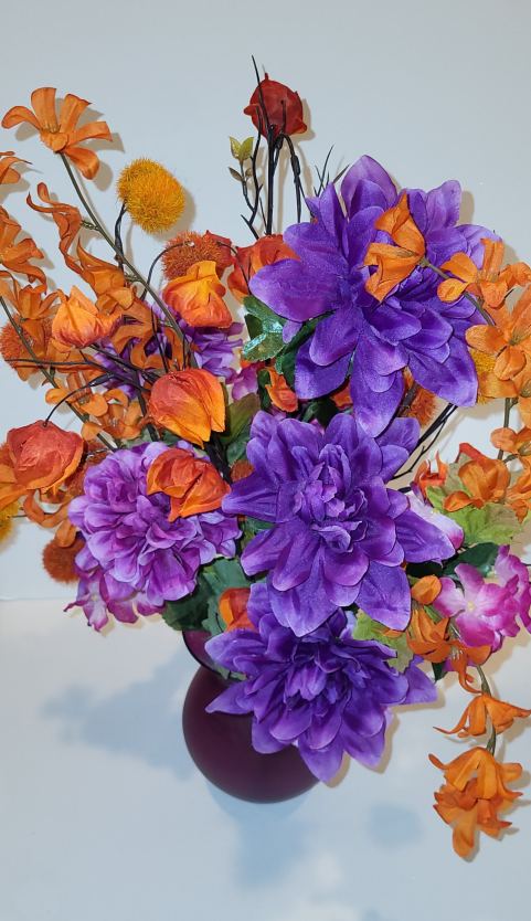 12" tall  Purple glass vase, beautiful purple orange silk flowers